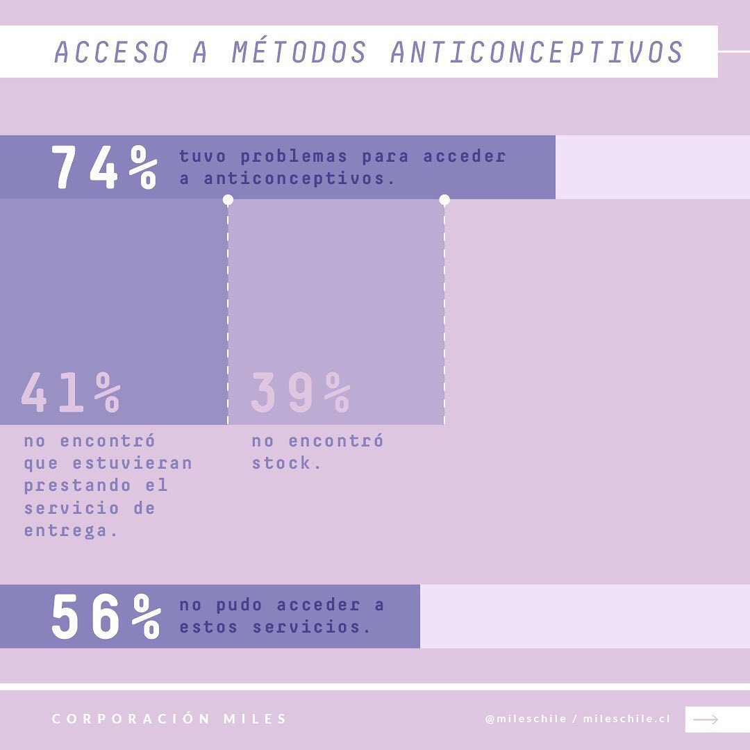 En esta misma línea, Corporación Miles, una ONG que vela por los derechos sexuales y reproductivos en Chile, en su segunda encuesta ‘Salud sexual y reproductiva en tiempos de Covid-19’ en la que se consideró una muestra de 500 mujeres aproximadamente. En términos generales, alertó que el 46% de las encuestadas presentó dificultades para acceder a servicios de salud sexual y salud reproductiva.