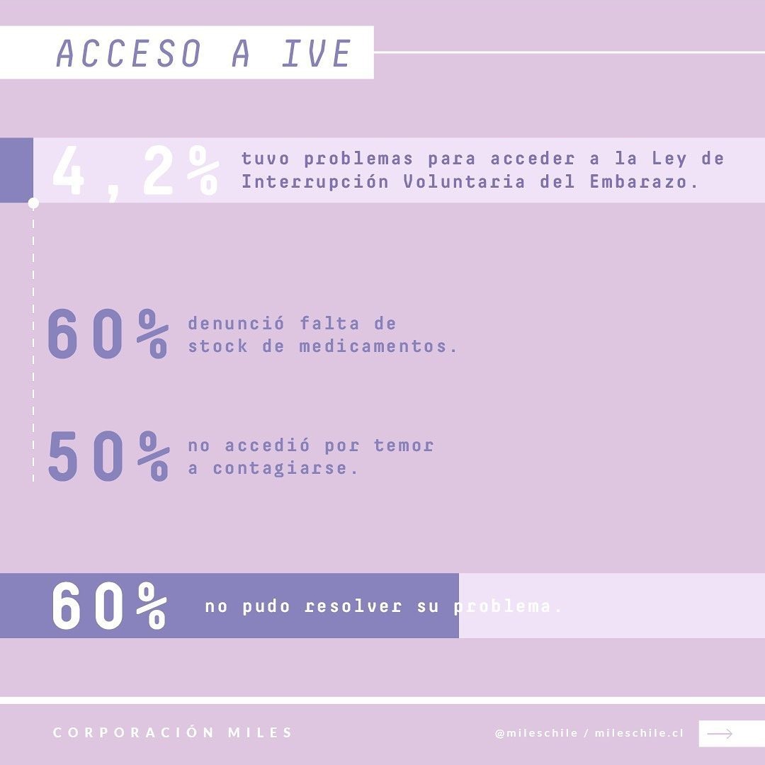 Específicamente, en el acceso al IVE determinó que un 4,2% de las encuestadas tuvo problemas para acceder a la ley de interrupción del embarazo. De ellas, una parte denunció falta de stock de medicamentos Misopostrol y Mifepristona (60%) otra no fue a recintos hospitalarios por temor a contagiarse (50% ) y un 60% finalmente no pudo resolver sus problemas.