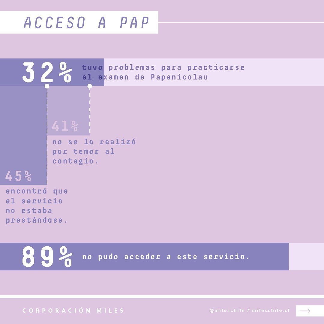 Respecto al PAP, un 89% no pudo acceder a este servicio de consulta, unos no se lo realizaron por temor a contagio (41%) mientras que la otra mitad se encontró con el servicio no estaba prestándose ( 45%).