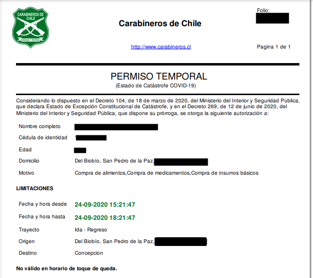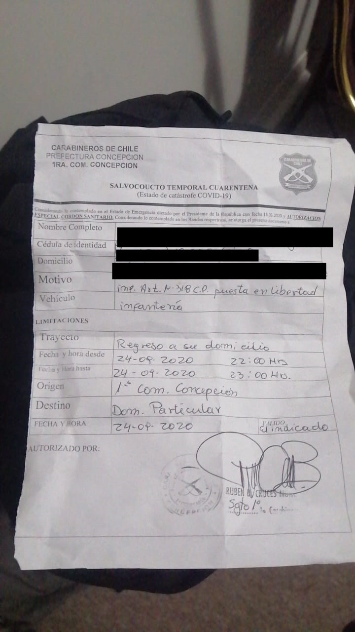 Solo a las 10 de la noche y, debido al cambio de turno, se les entrega un salvoconducto para que puedan irse a sus casas, estando detenidos cinco horas en total. “Había mucha gente detenida que sí portaba permisos y cuando pregunté por qué me dijeron que (las detenciones) quedaba al criterio de cada carabinero”.