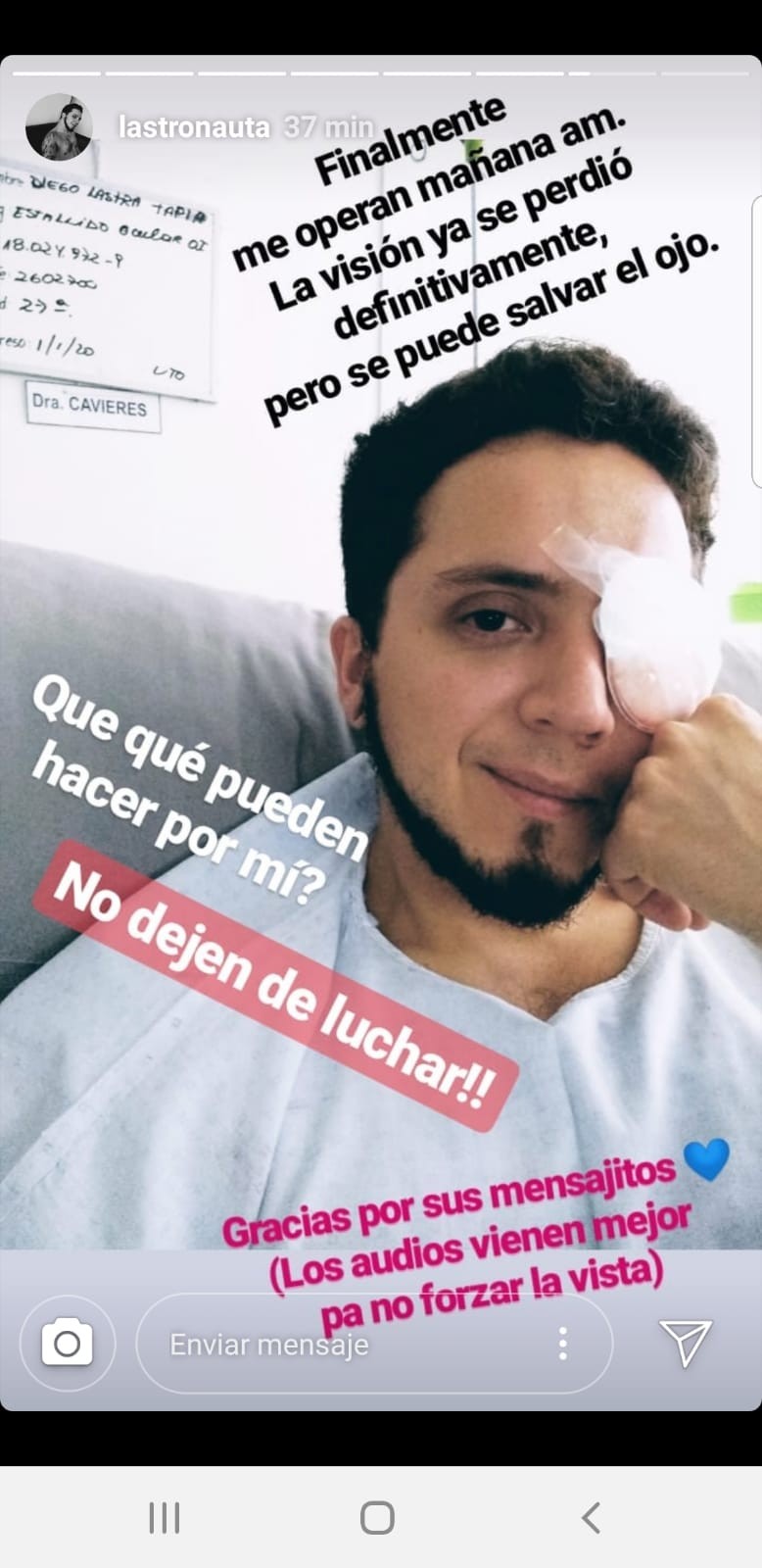 Un joven estudiante de medicina de la Universidad Diego Portales, habría recibido entre las 1:00 - 2:00 AM, el impacto de una bomba lacrimógena en su rostro, siendo inmediatamente derivado a la Unidad de Trauma Ocular del Hospital Salvador. A la tarde de hoy ya se sabía que el joven herido se trataba de Diego Lastra Tapia de 27 años de edad, quién además habría sido presidente años atrás del centro de estudiantes de la escuela de medicina de dicha casa de estudios. En conversación con Resumen, un familiar del afectado indicó que Diego se encuentra estable y con buen ánimo, habiendo manifestado a sus cercanos “la inquebrantabilidad de su espíritu”, esto pese a que sería un hecho la perdida del 100% de la visión de su ojo izquierdo.