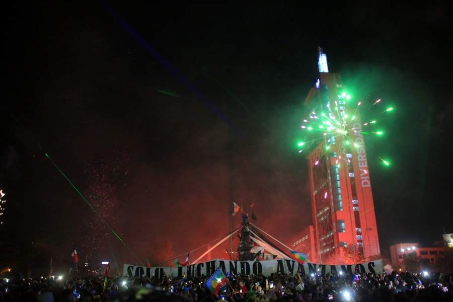 Imagen principal: manifestaciones y celebraciones de año nuevo en la Plaza Baquedano o Plaza de la Dignidad en Santiago, fuente: Agencia UNO