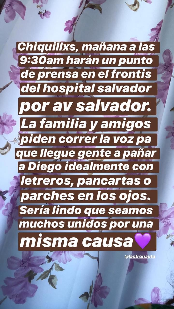 Finalmente, cabe consignar que la familia de Diego Lastra se encuentra convocando para este viernes 03 de Enero a las 9:30am a una conferencia de prensa en el frontis del Hospital Salvador para actualizar sobre el estado de salud de Diego.