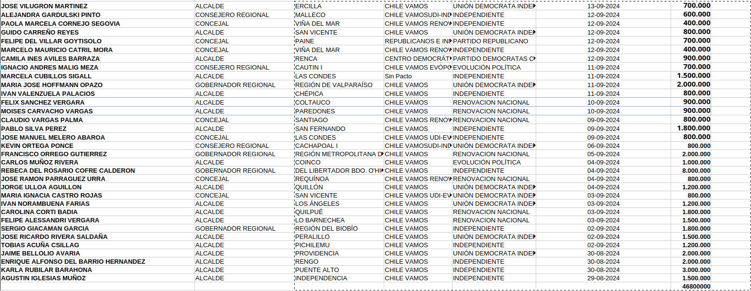 Entre los que más destacan están los hechos a Karla Rubilar, que postula como alcaldesa de Puente Alto, recibió 3 millones de pesos. Jaime Bellolio que se postula como alcalde de Providencia recibió 2 millones de pesos. Marcela Cubillos, que va como candidata a alcaldesa de Las Condes, obtuvo 1,5 millones, misma cifra que aportó Sutil a Felipe Alessandri, que aspira a alcalde de Lo Barnechea. El UDI Jorge Ulloa que se trasladó del Biobío a Ñuble a competir como alcalde de Quillón, recibió 1,2 millones, misma cifra que recibió Iván Norambuena, otro histórico de la costa del Bíobío que probará suerte en el sillón edilicio de Los Ángeles.