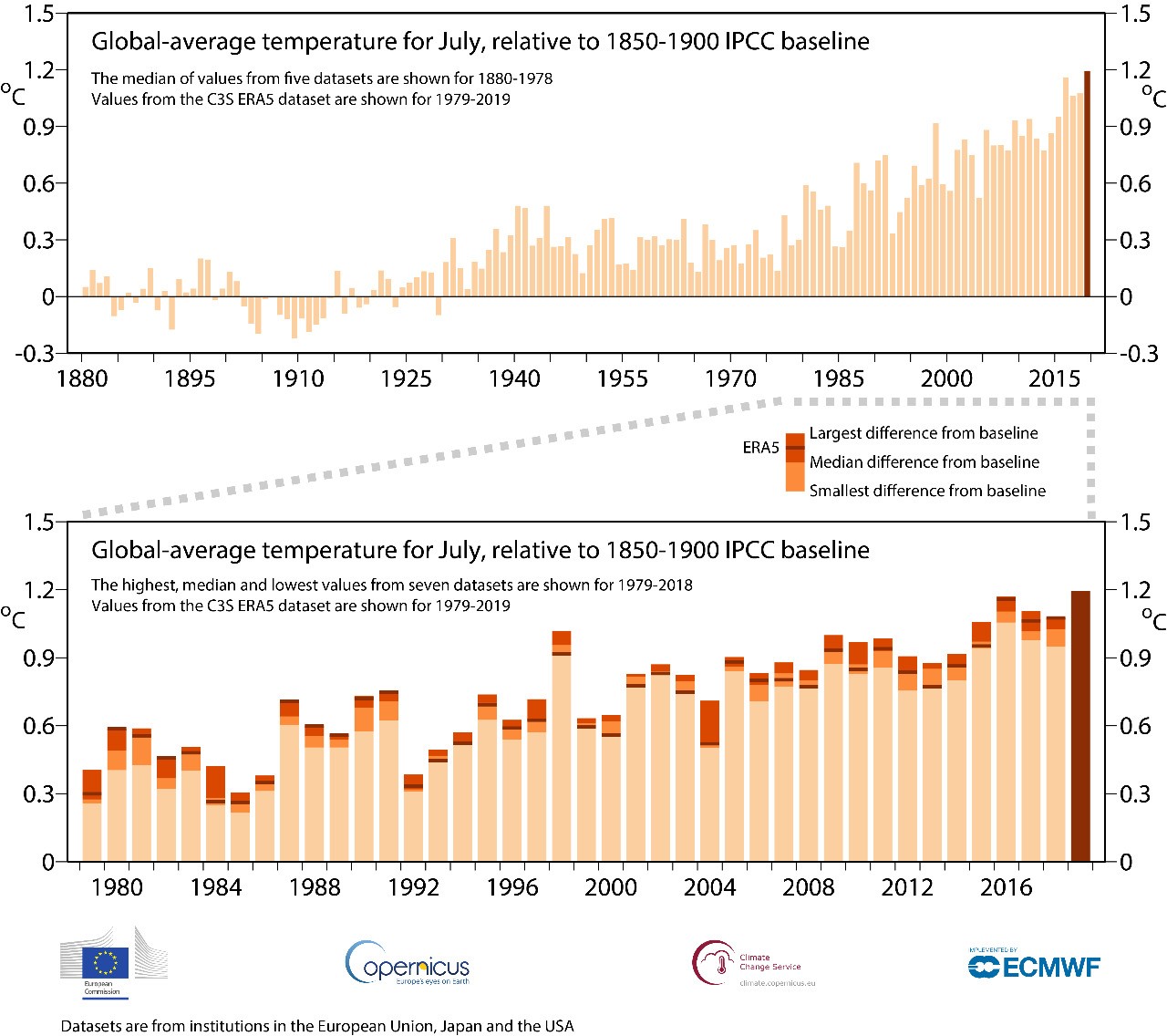 Este pasado mes de julio ha sido el mes más caluroso con respecto a la temperatura promedio global desde que se toman los registros instrumentales. Se ha superado el récord anteriormente alcanzado en julio del 2016, aproximándose peligrosamente a los +1,5°C (Alcanzó +1,2°C) en relación a las temperaturas preindustriales. Muchos científicos han apuntado que este es el punto de no retorno de una crisis climática que ya es una realidad.