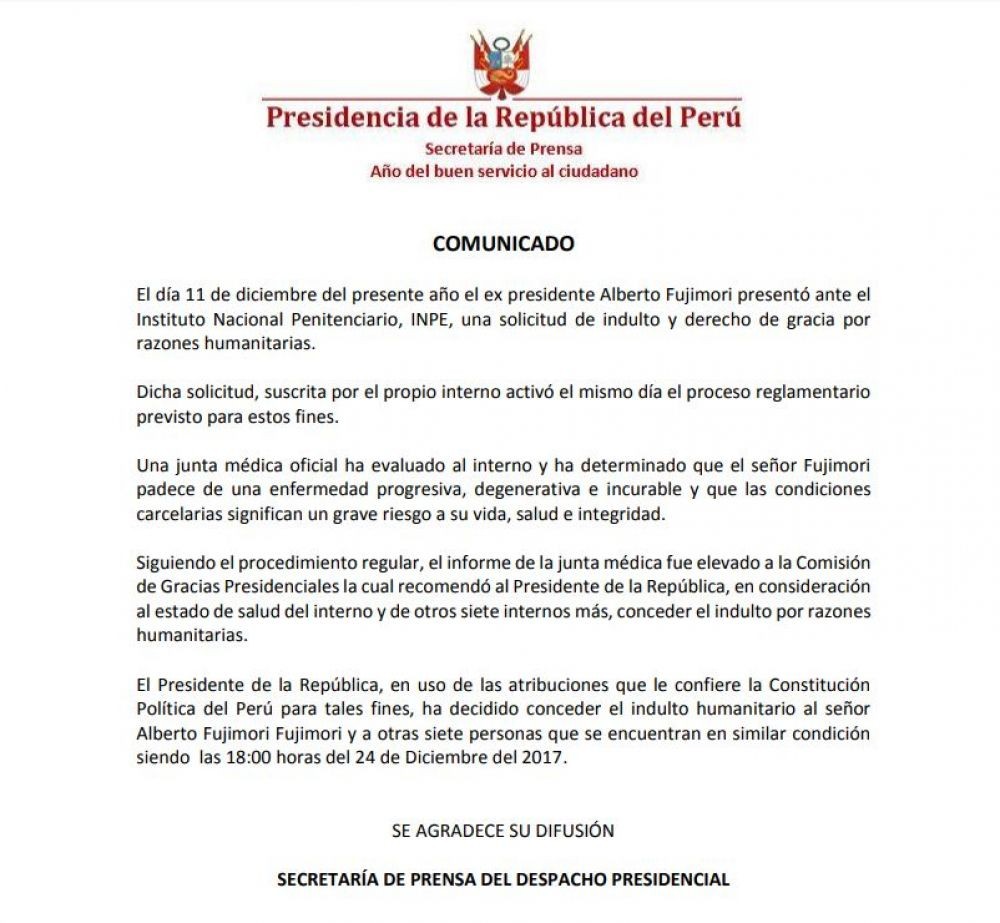 Alberto Fujimori había sido internado este sábado en una clínica por un cuadro de hipotensión y arritmia. El comunicado de la presidencia señala que "Una junta médica oficial ha evaluado al interno y determinado que el señor Fujimori padece de una enfermedad progresiva, degenerativa e incurable y que las condiciones carcelarias significan un grave riesgo a su vida, salud e integridad". El comunicado también indica que otras 7 personas más fueron beneficiadas con el indulto.