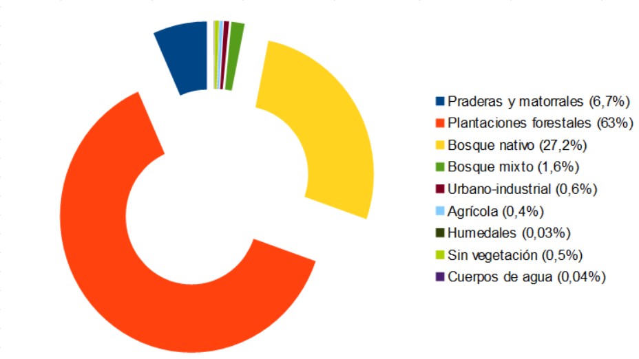 El siguiente gráfico muestra en distintos colores las coberturas de uso de suelo en la comuna de Curanilahue destacando en color naranja las plantaciones forestales con el 63 %.