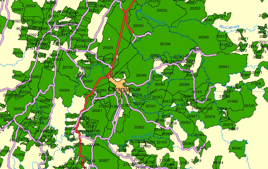 El siguiente mapa muestra los predios de Forestal Arauco, la principal empresa forestal que opera en la comuna, con sus predios en color verde.