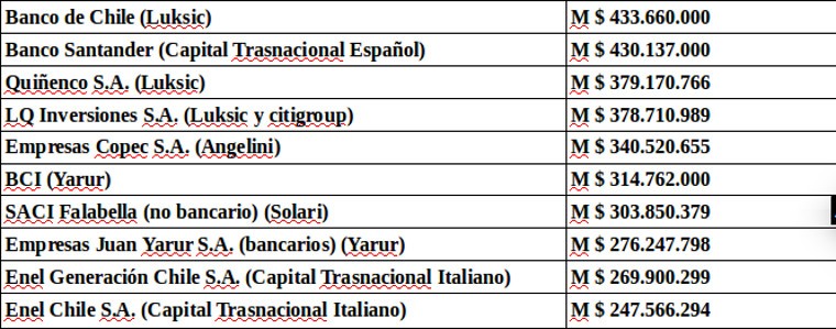 Como era de esperar, los primeros puestos son ocupados por los bancos quienes han obtenido ganancias multimillonarias, donde el aumento promedio de la banca es de un 9,7% en comparación con el año 2016, y, respecto del tercer trimestre, alcanzó un alza del 6%. Los aumentos los encabeza la banca y sectores ligados al capital financiero como las AFP, donde el Banco Chile (del grupo empresarial Luksic) y Banco Santander (capitales trasnacionales Españoles), seguidos por la misma filial de Luksic Quiñenco (bancario). De las 10 empresas que mantuvieron y aumentaron sus utilidades el 2017, en su mayoría, están ligados a la banca, donde igualmente esta parte del negocio de Copec (Angelini), Saci Falabella y Enel.