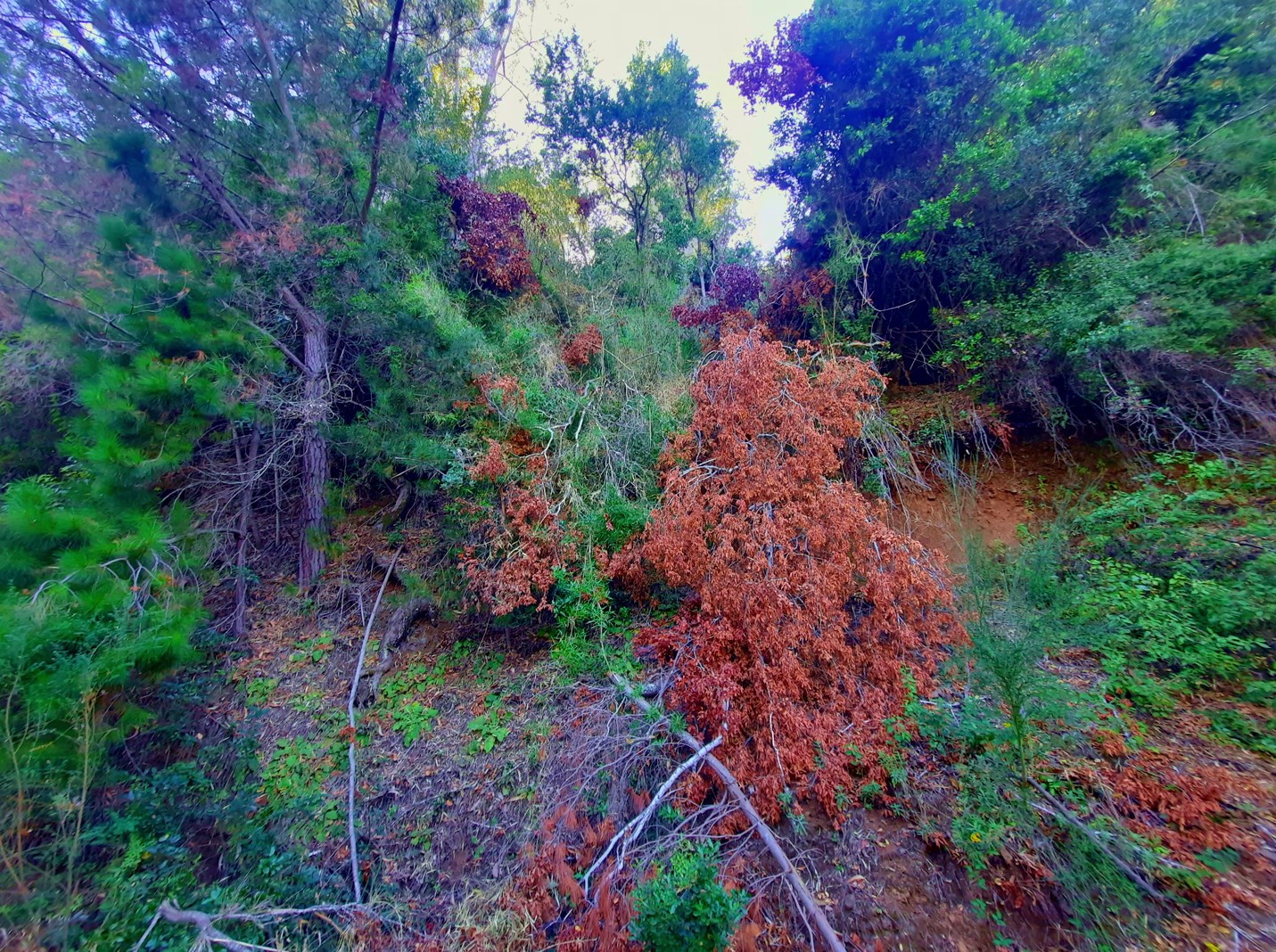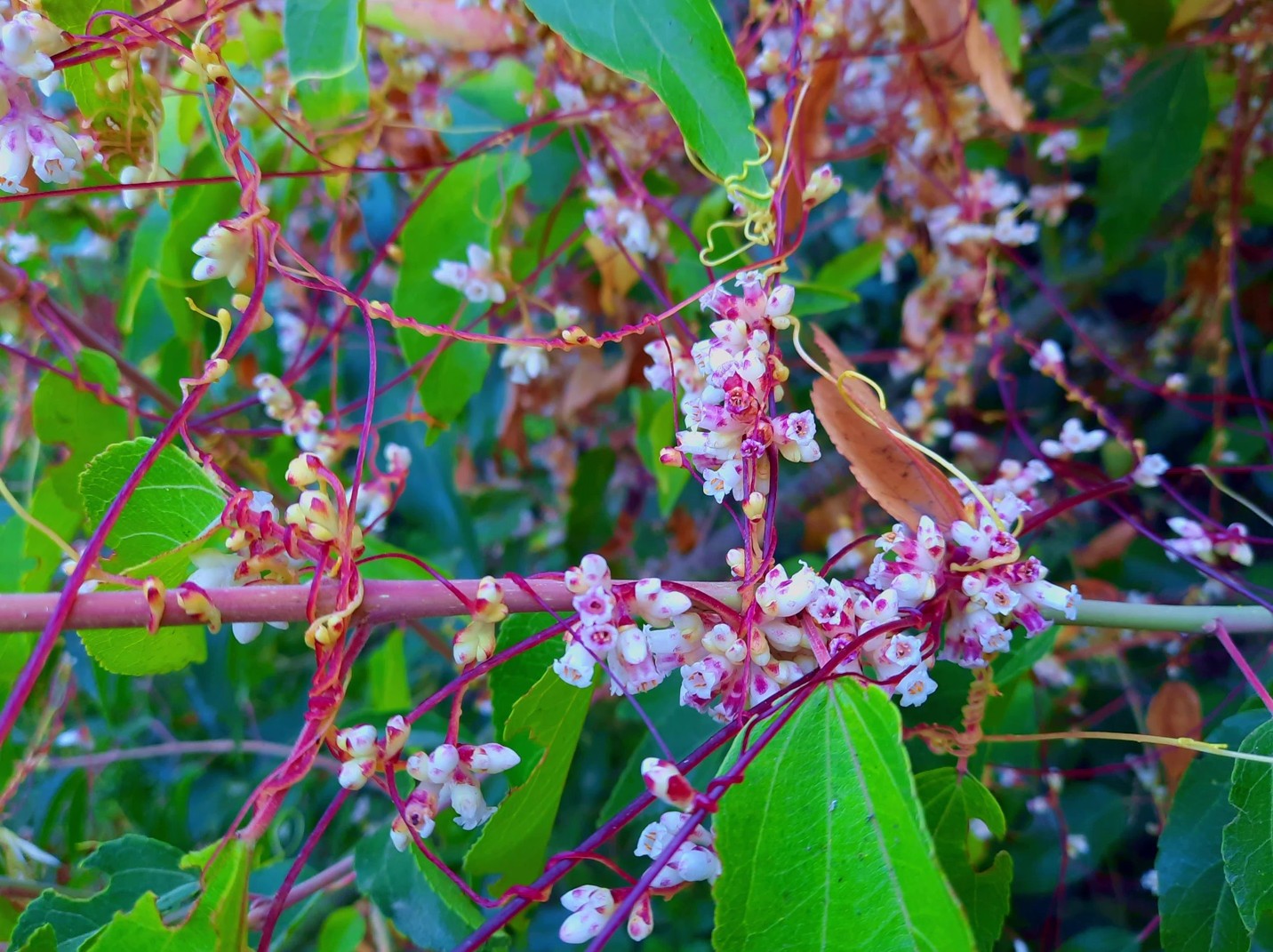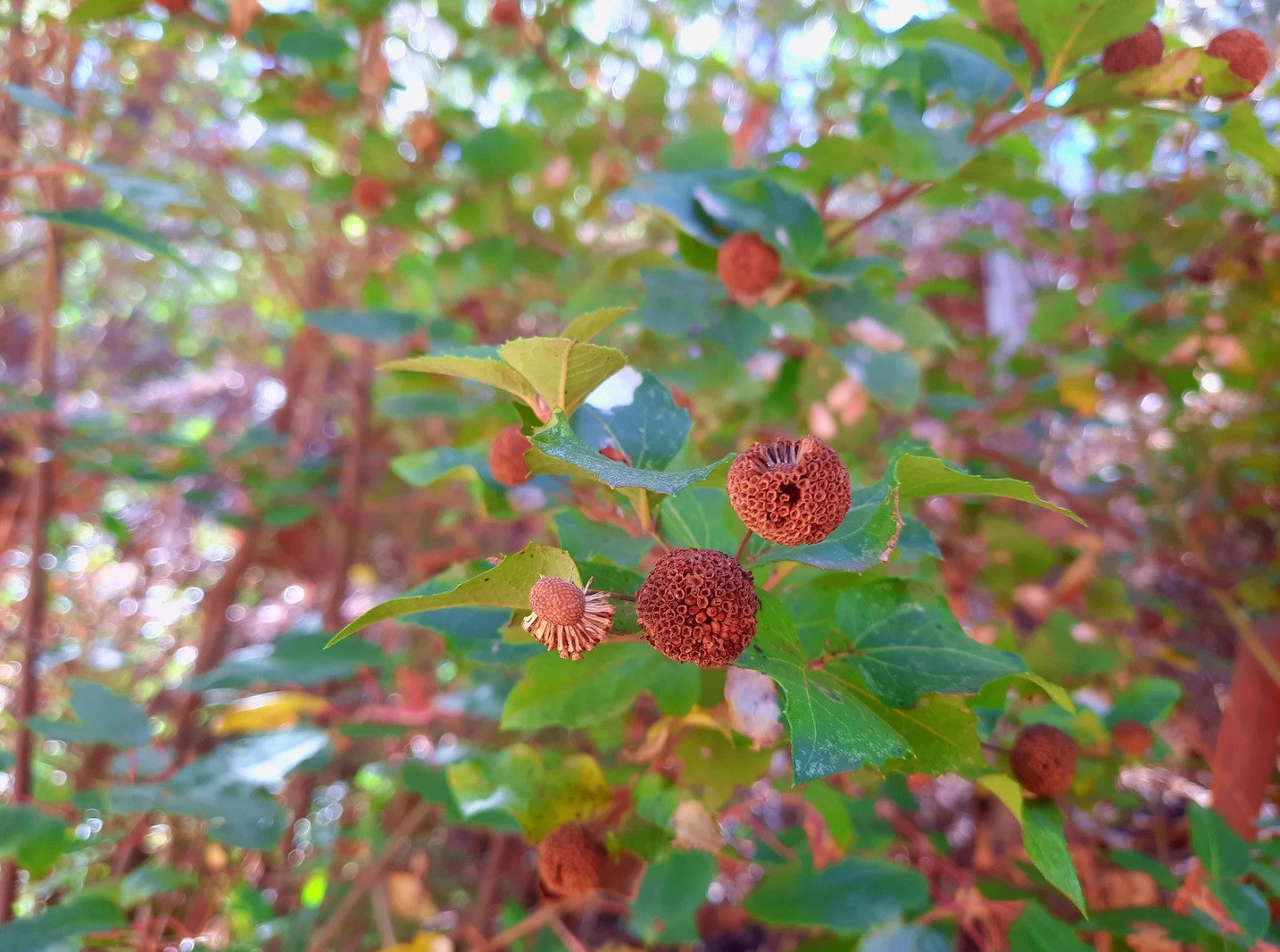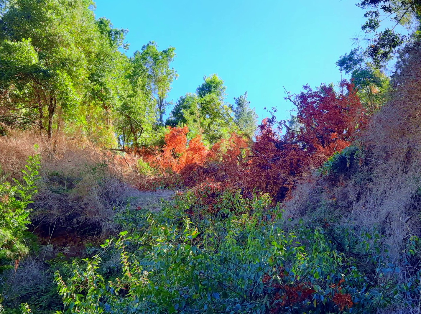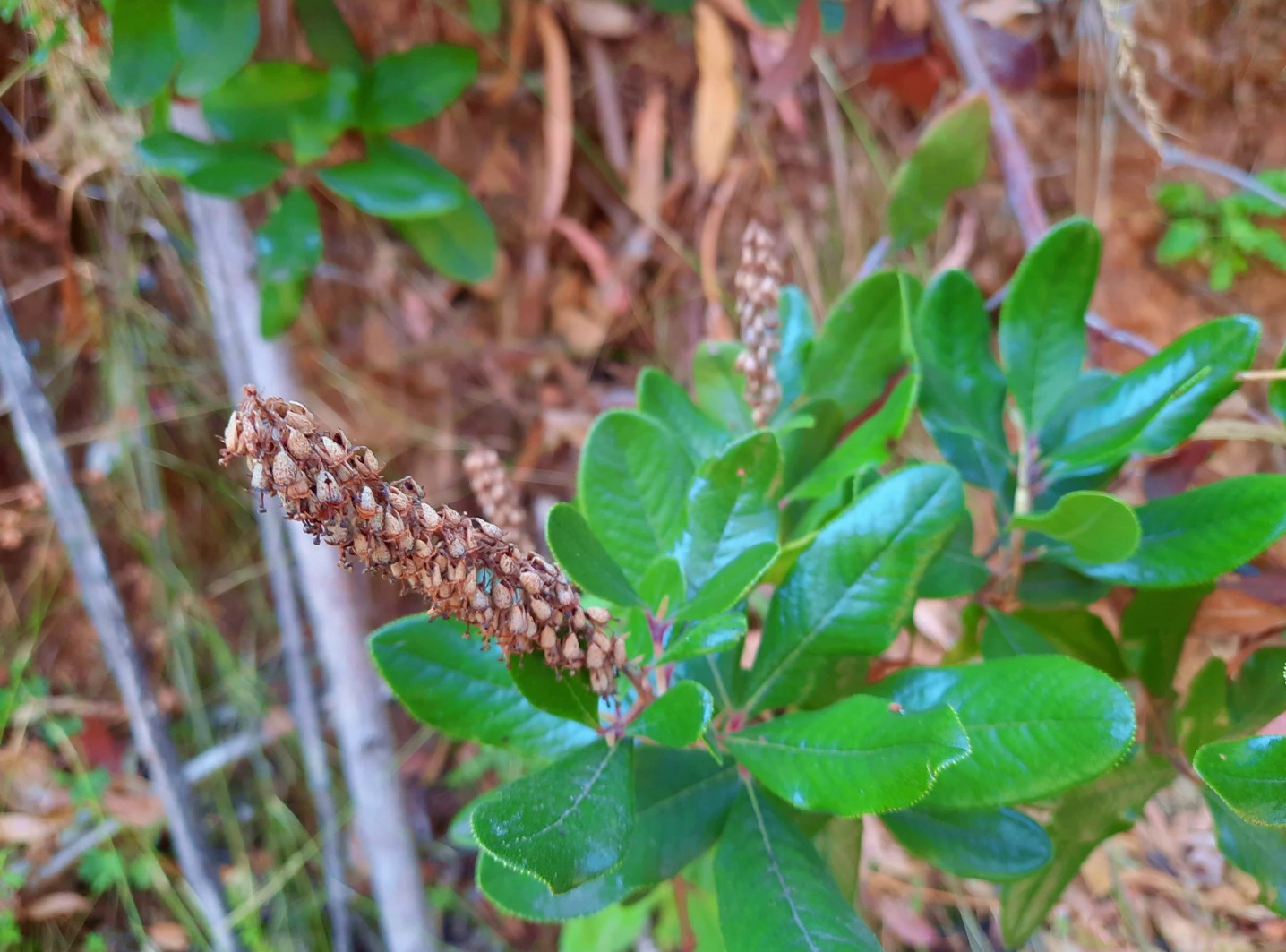 Siguiendo el recorrido nos encontramos con muchas otras especies nativas o endémicas como Palo Negro (Podantus mitiqui) (ver foto 11), Roble (Nothofagus obliqua) (ver foto 13), Deu (Coriaria ruscifolia) (ver foto 14), Corontillo (Escallonia pulverulenta) (ver foto 15), Llaupangue (Francoa apendiculata) (ver foto 16), Cabello de Ángel (Cuscuta chilensis) (ver foto 17), Tola Blanca (Proustia pyrifolia) (ver foto 18) y Naranjillo (Citronella mucronata) (ver foto 19) (Donoso Zegers & Ramírez García, 2000) (Menegoz & Zapata, 2017).