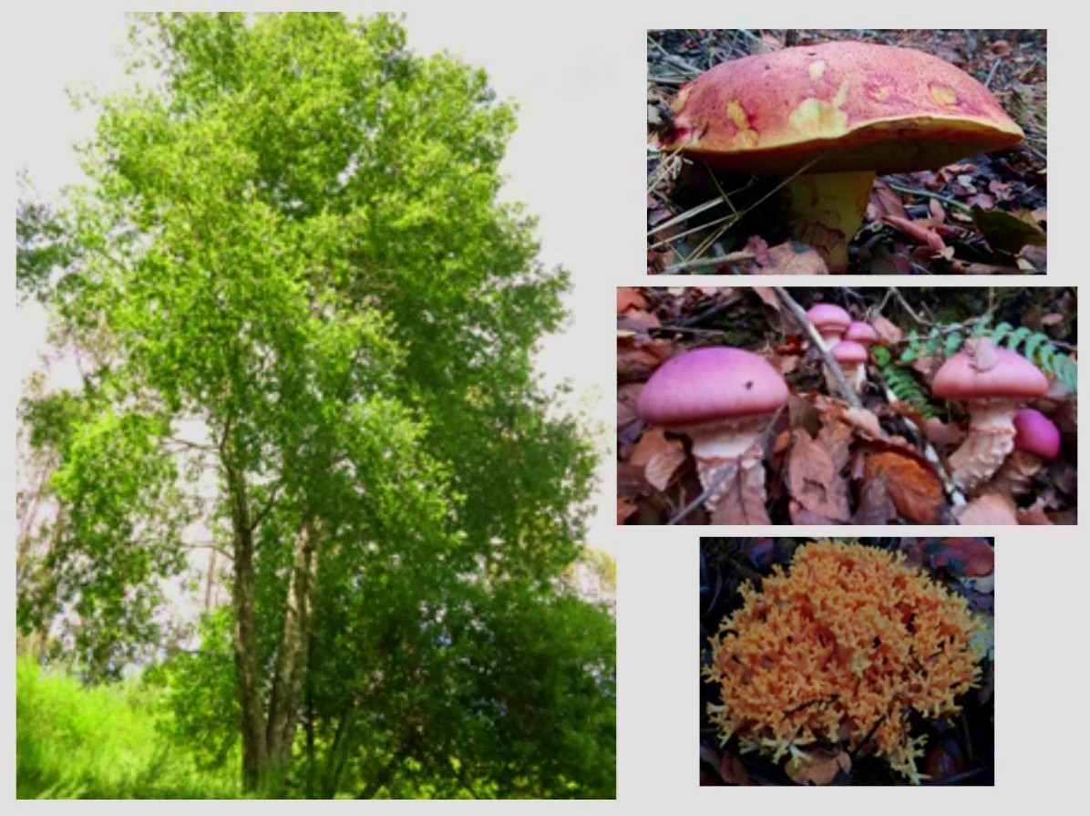 Foto 13: Se observa el árbol nativo Roble (Nothofagus obliqua) y algunos de sus hongos micorrícicos; Loyo (Butyriboletus loyo), Lebre (Cortinarius lebre) y Changle (Ramaria sp). (Imágenes referenciales fotografiadas en otros sectores de Hualqui).