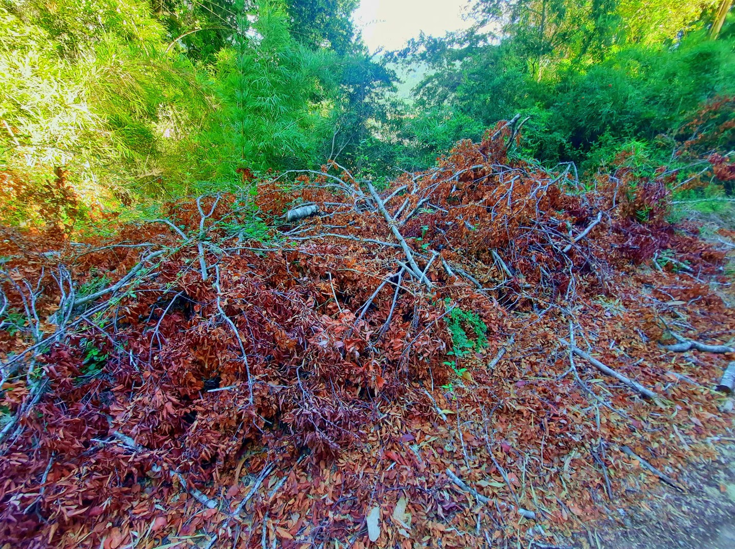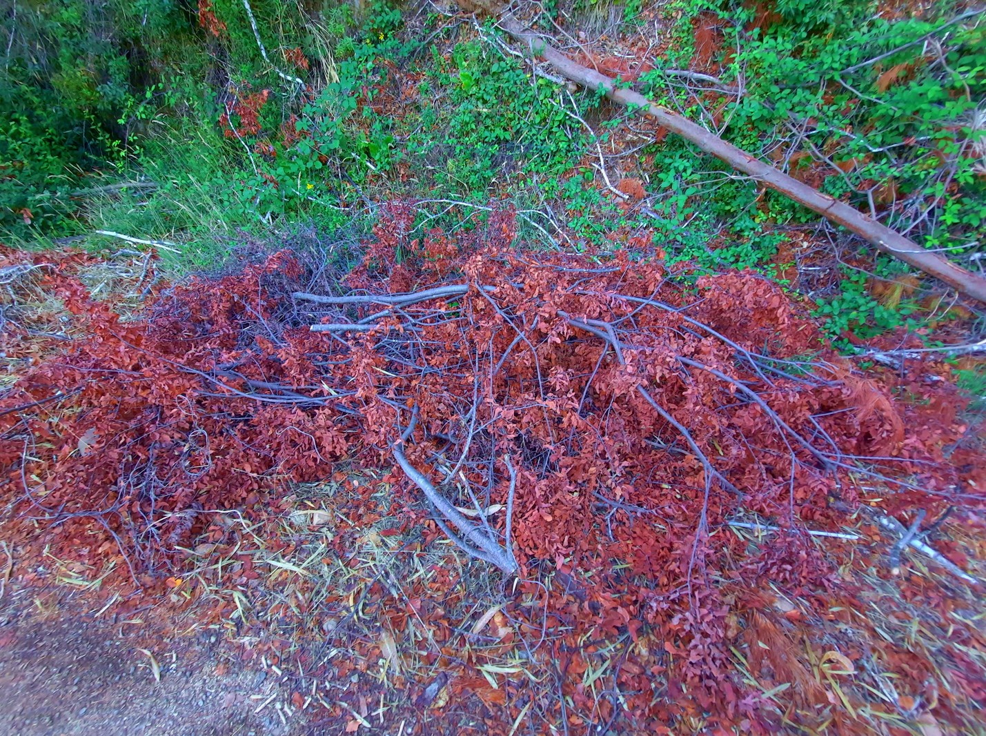 Al seguir avanzando empezamos a notar el panorama desolador de cientos de restos de ramas que quedaron en el camino como desechos de la extracción indiscriminada, principalmente de Roble (ver fotos 20-26), además junto a estos se observó un bidón de aceite para motosierras botado (ver foto 27), pudiendo contaminar el entorno y al ser inflamable, aumenta el riesgo de incendio forestal.
