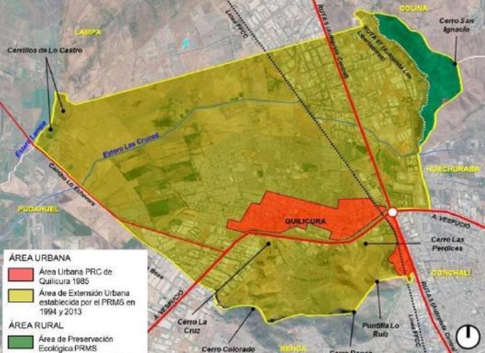 Área Urbana PRC de Quilicura de 1985 y Área de Extensión Urbana establecida por el PRMS 1994 y 2013
