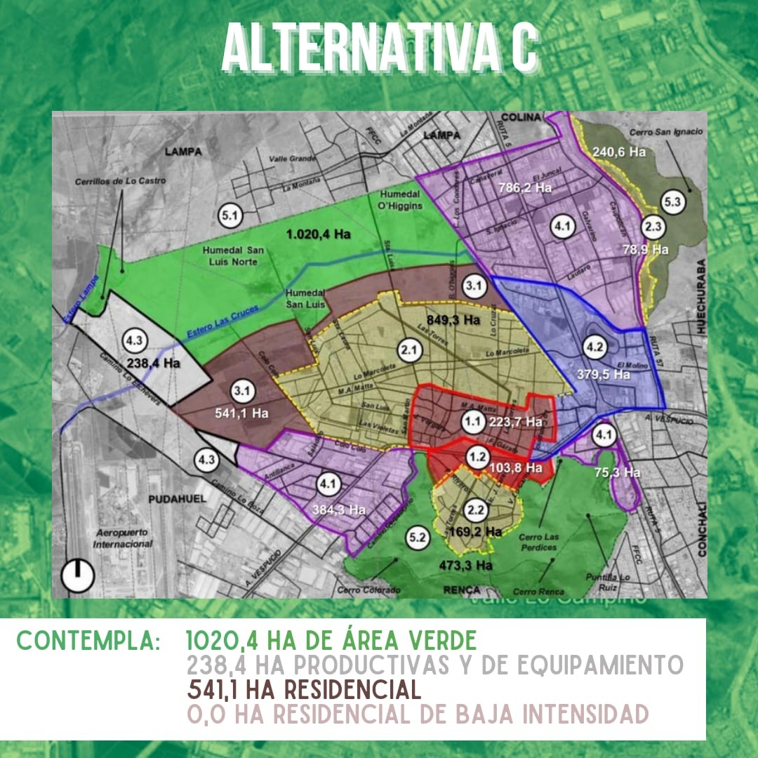 El único uso de suelo que impide construir es el área verde, el que está contemplado en las 3 imágenes objetivos del PRC, siendo la alternativa C la que reconoce mayor cantidad, al reconocer 1.020,4 hectáreas de áreas verdes al entorno de los humedales reconocidos, lo que mitiga significativamente el impacto inmobiliario, pero a la vez contempla 541,1 hectáreas de área residencial con un máximo de 6 pisos de altura al sur del área verde y 238,4 hectáreas de actividades productivas y equipamiento al poniente limitando con camino Lo Echevers, lo que resulta problemático para las aspiraciones de recuperar los humedales, debido a la gran altura de las edificaciones que les quitarían valor paisajístico al interferir la vista a los Cerros de Renca, cerros islas con alto valor patrimonial que han sido deteriorados por las acciones antrópicas santiaguinas.