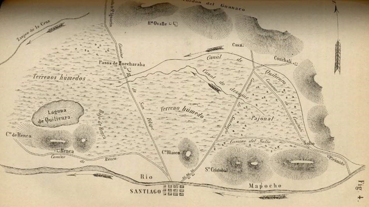 Mapa rescatado de la investigación “Desecación de las Vegas en Chile”, publicada en la Revista de la Universidad de Chile. Dr. T. Mostardi-Fioretti y Pedro de la Cuadra. 1864.