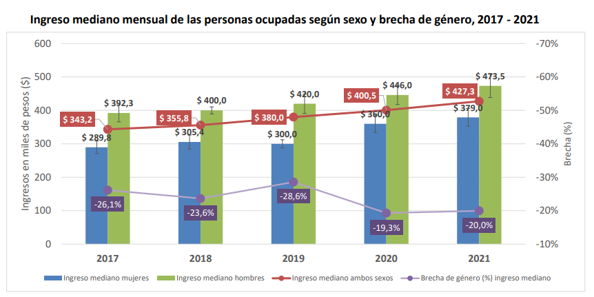Asimismo, la mediana de salario para los hombres fue de $500.000 y para las mujeres de $405.348.