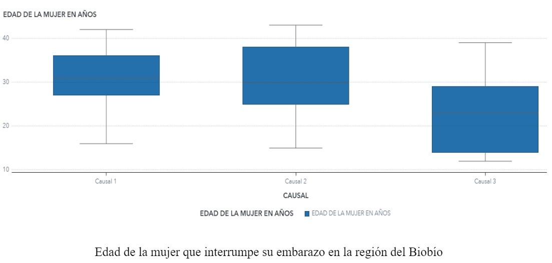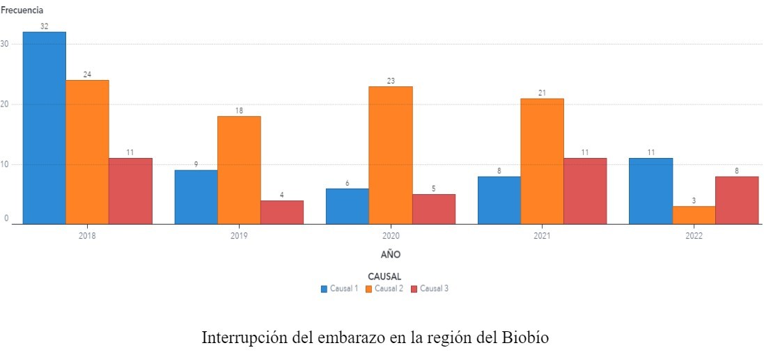 En el caso del Biobío, fue en 2018 cuando se registraron más casos, con un total de 86 abortos. Con respecto al rango de edad de la primera causal que decide interrumpir su embarazo es desde los 16 años hasta los 42; en la causal dos es desde los 15 años hasta 43; en la causal tres es desde los 12 años hasta los 39.