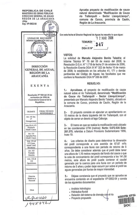 [caption id="attachment_114351" align="alignnone" width="452"] Autorización de la DGA a empresario para desviar brazo del río que anteriormente llegaba al lago Caburgua[/caption]