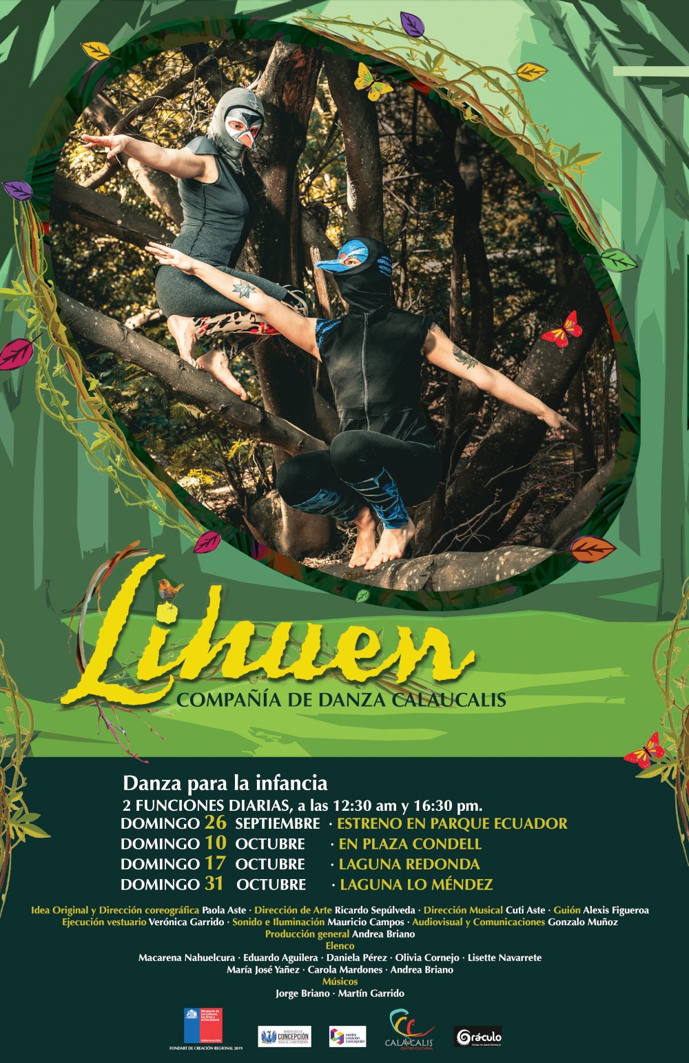 El elenco está compuesto por bailarinas y bailarines locales, muchos de los cuales se formaron inicialmente en el desaparecido Centro de Danza Calaucán, y actualmente son parte de la Compañía de Danza Calaucalis: Mararena Nahuelcura, Eduardo Aguilera, Andrea Briano, Daniela Pérez, además de bailarinas invitadas de la Compañía Con Tensión María José Yáñez y Carola Mardones; y del Colectivo Incorpóreas Olivia Cornejo y Lissete Navarrete. A ellas se suman los músicos, dirigidos por Cuti Aste, compositor de las piezas musicales; interpretación y arreglos de Jorge Briano y Martín Garrido.