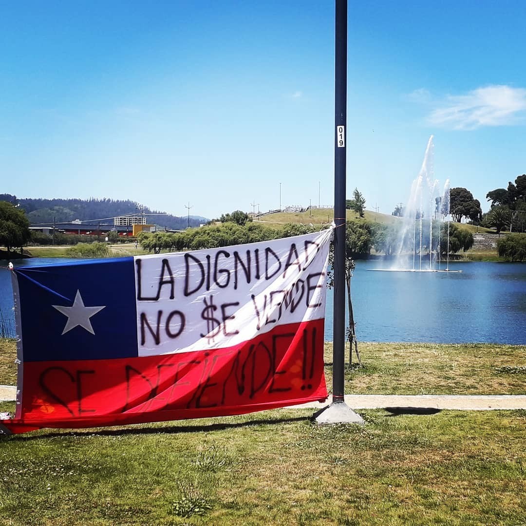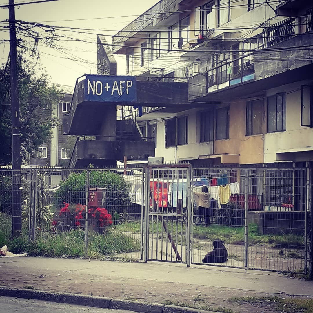 31 de octubre de 2019. De viviendas ubicadas en la calle Aníbal Pinto en Concepción cuelga un lienzo con la histórica consigna: “No + AFP”, en referencia al nefasto sistema de pensiones instaurados durante dictadura. | Fotografía: Resumen