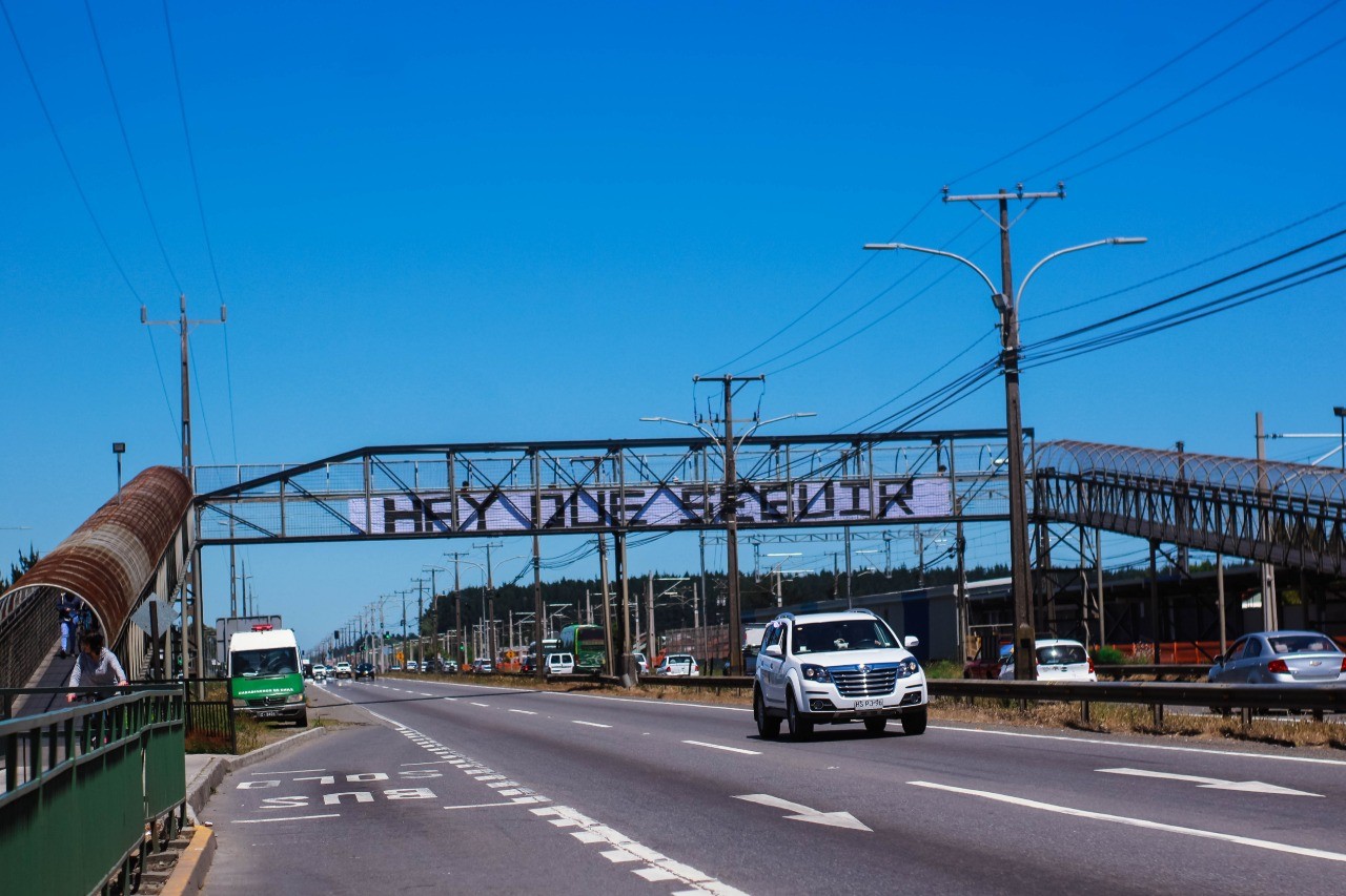 En la pasarela del sector de Lomas Coloradas se despliega el icónico lienzo con la frase “HAY QUE SEGUIR” | Fotografía: Verónica Milla