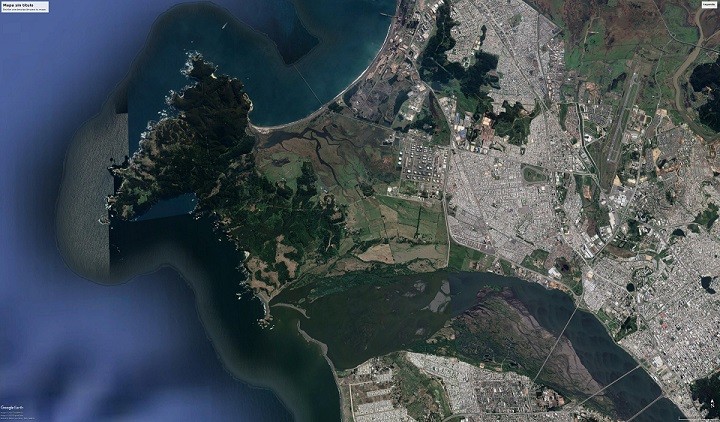Fotografía satelital de la península, al costado Hualpén, y abajo el Río Biobío y su desembocadura. Fuente: Google Earth