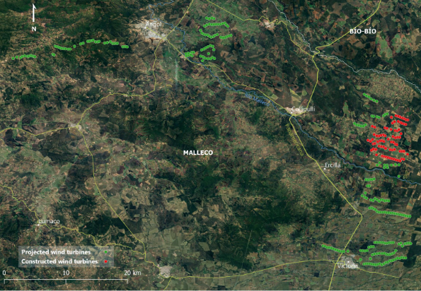 Mientras la opinión pública pone cada vez más en cuestión el avance de la energía eólica por Malleco, debido a su nula contribución a la economía local, su conflicto con las demandas Mapuche, su alianza con terratenientes locales, y sus impactos ambientales negativos, el Servicio de Evaluación Ambiental ha, solamente este año, aprobado dos proyectos eólicos más, alcanzando ya un número de siete proyectos eólicos preparados para iniciar construcción (véase Tabla). En el siguiente Mapa se aprecia todas las turbinas proyectadas entre las comunas de Angol, Collipulli, Ercilla y Victoria.