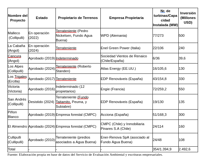 Los proyectos, con una excepción, pertenecen a empresas forestales chilenas y empresas energéticas de Estados Unidos o la Unión Europea y pretenden instalar un total de más de 350 turbinas eólicas. La mayoría de los proyectos se han aprobado sin consulta indígena o ciudadana y casi la totalidad se instalan en predios de grandes terratenientes agrícolas o empresas forestales, quienes son los actores locales que más se benefician monetariamente mediante contratos de arrendamiento. Para los vecinos, dejan poco más que efectos negativos, cerramiento de caminos rurales, y la llegada de guardias de seguridad y presencia policial y criminalización de la protesta política Mapuche y no-Mapuche.