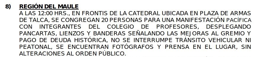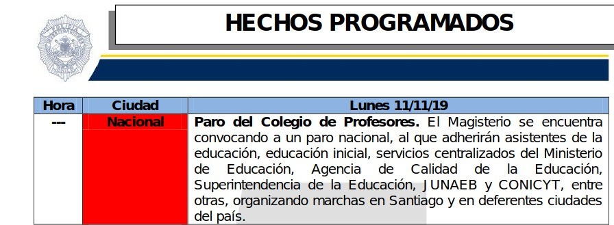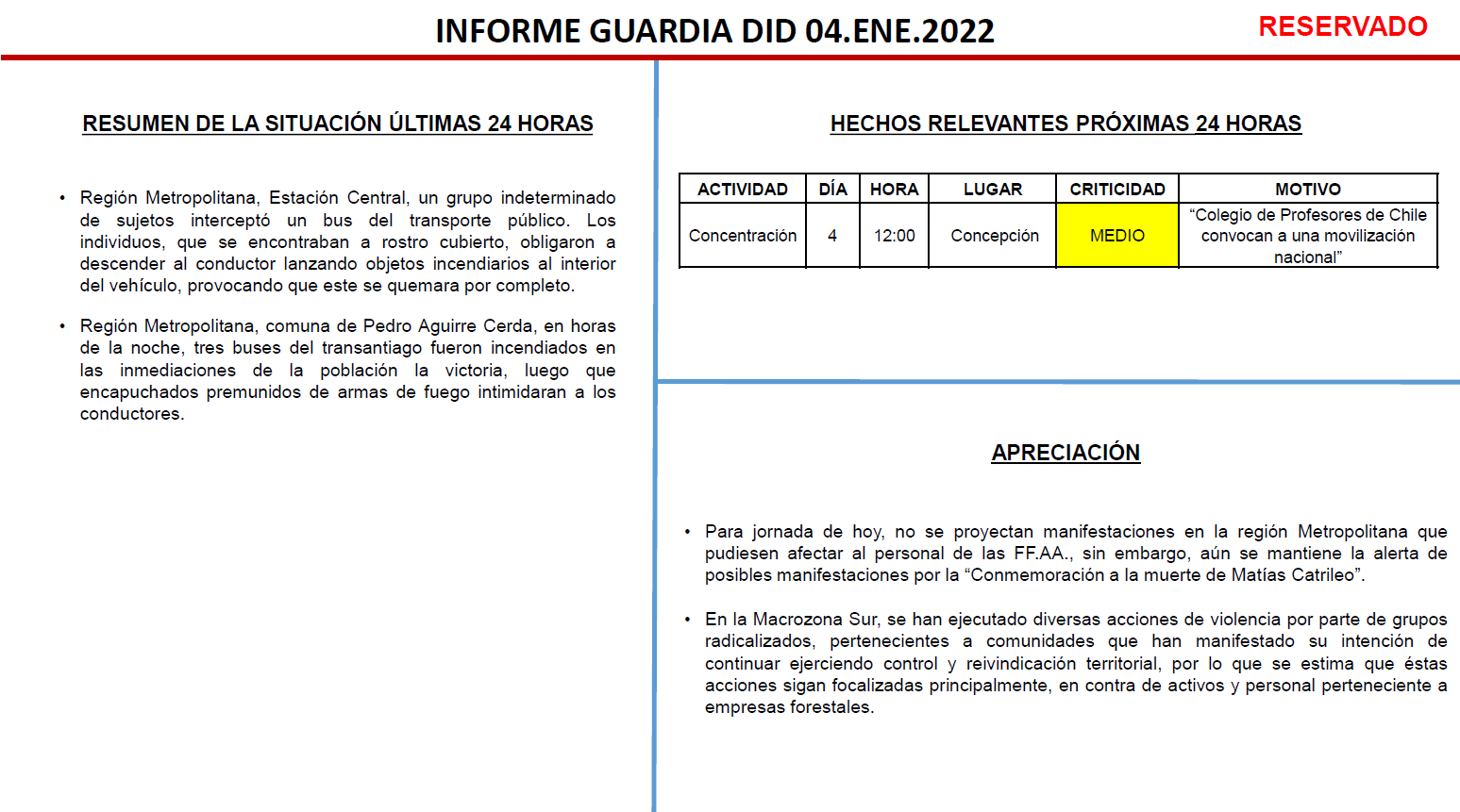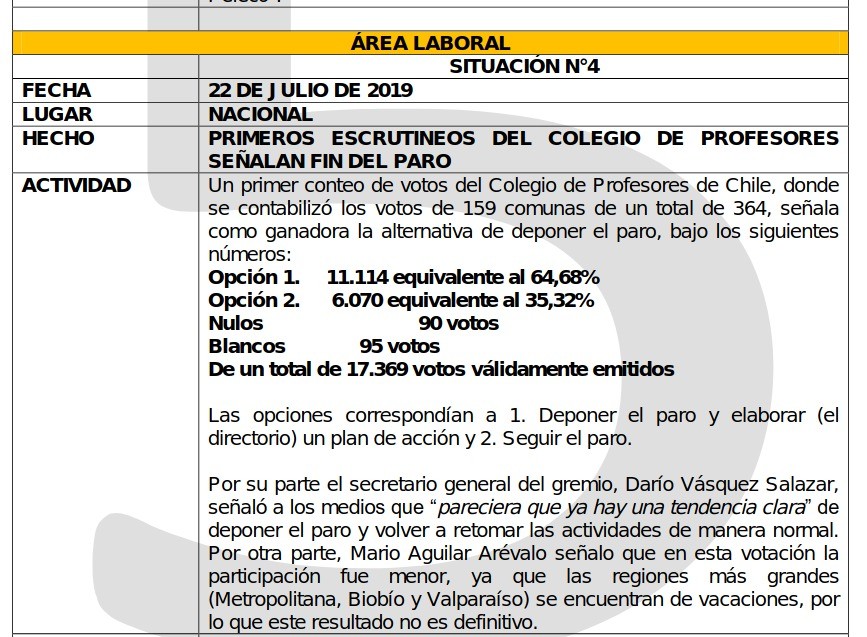 Pero el espionaje a la actividad del gremio docente continuó durante este año. A través de un Informe de Guardia DID del 4 de enero de 2022, se reporta el seguimiento a una convocatoria a movilización nacional del profesorado, la que contó además con una calificación de criticidad media. Todo lo anterior formó parte del reporte diario realizado por el Estado Mayor Conjunto (EMCO).