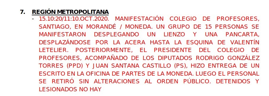 Dicho espionaje al Colegio de Profesores continuó iniciado el 2020, tras los primeros meses de Estallido Social. En concreto, desde el Estado Mayor Conjunto se siguieron las manifestaciones convocadas por las y los docentes en octubre de dicho año. Por ejemplo, en Santiago, donde se especificaba el lugar de la convocatoria, la cantidad de personas y la entrega de una carta en la oficina de partes de la moneda.