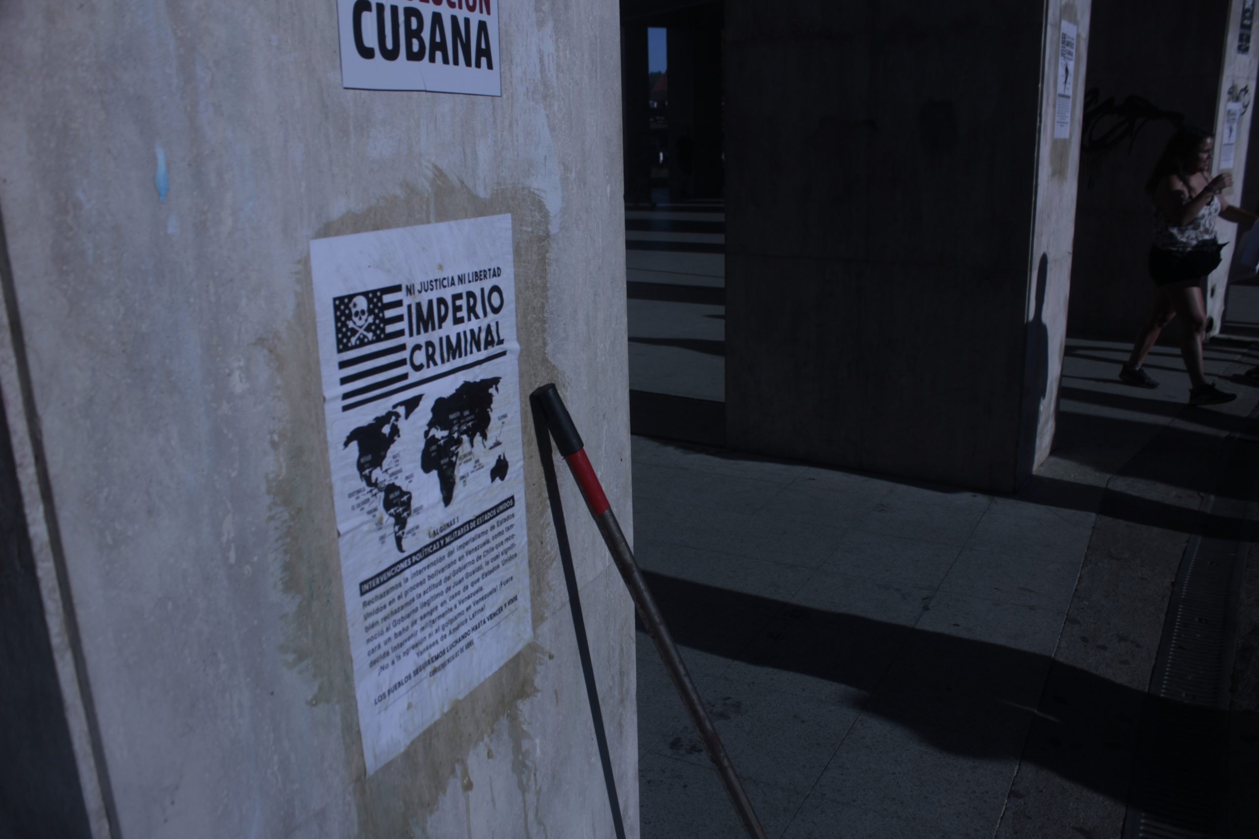 Afiche pegado en pilares de Tribunales en Concepción, rechazando el golpismo estadounidense en Venezuela | Resumen.cl