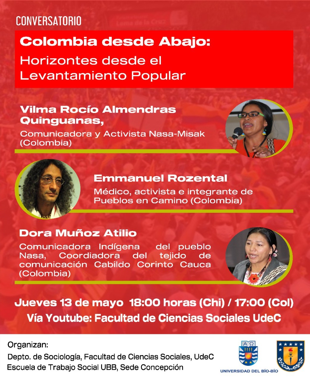En este contexto, mañana jueves 13 de mayo se realizará el conversatorio virtual "Colombia desde abajo: Horizontes desde el levantamiento popular" con activistas indígenas del Cauca. El encuentro será transmitido en el canal de YouTube del canal de la Facultad de Ciencias Sociales de la Universidad de Concepción. En la instancia se conocerá de primera fuente la situación desde uno de los puntos más reprimidos por el Estado colombiano.