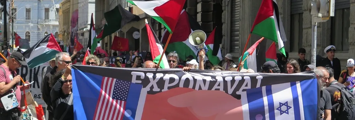 Cientos de porteños y porteñas marcharon este martes en Valparaíso en contra de la Exponaval, solidarizando con el pueblo palestino y denunciando el genocidio cometido por Israel en la Franja de Gaza.