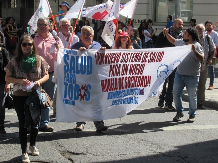 Alrededor de un millar de manifestantes, integrantes de distintos gremios de salud pública, agrupaciones sociales populares organizadas en torno a luchar por una salud digna, junto a familias y militantes de organizaciones políticas, se congregaron en la Plaza Sotomayor de Valparaíso para luego marchar por las calles céntricas mostrando su descontento con las precarias condiciones en que funciona la Salud Pública, precarización que es consecuencia de un modelo orientado a la privatización y al lucro, que se inició durante la dictadura, pero que ha continuado profundizándose durante los gobiernos civiles . Pequeñas reformas realizadas con mucho bombo publicitario, pero con nulos efectos prácticos para los usuarios y que en nada afectan el modelo privatizador, se han transformados en verdaderos “parches curitas”, como los propios manifestantes expresan.