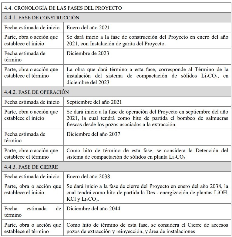 El proyecto contempla tres fases de elaboración dividida en meses de trabajo: construcción, operación y cierre, proceso en el cual declaran que existirá un impacto al ecosistema en términos de pérdida de fauna de mediana y baja movilidad, como también consecuencias en el habitar de las comunidades Colla del territorio, por lo que se perspectiva una política de mitigación que considera inducción sobre aspectos socioculturales a los trabajadores, creación de viviendas y protección de animales en todo lo que es la ruta que se contempla utilizar.