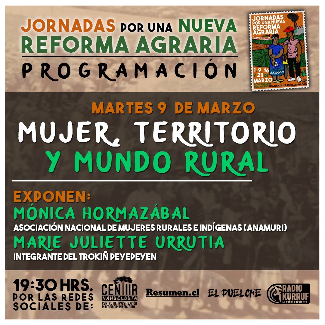 Así también una mirada desde las mujeres rurales con la exposición "Mujer, territorio y mundo rural" que se realizará el martes 9 de marzo, de la mano de Mónica Hormazábal, de la Asociación Nacional de Mujeres Rurales e Indígenas y Marie Juliette Urrutia, integrante del Trokiñ Peyepeyen.