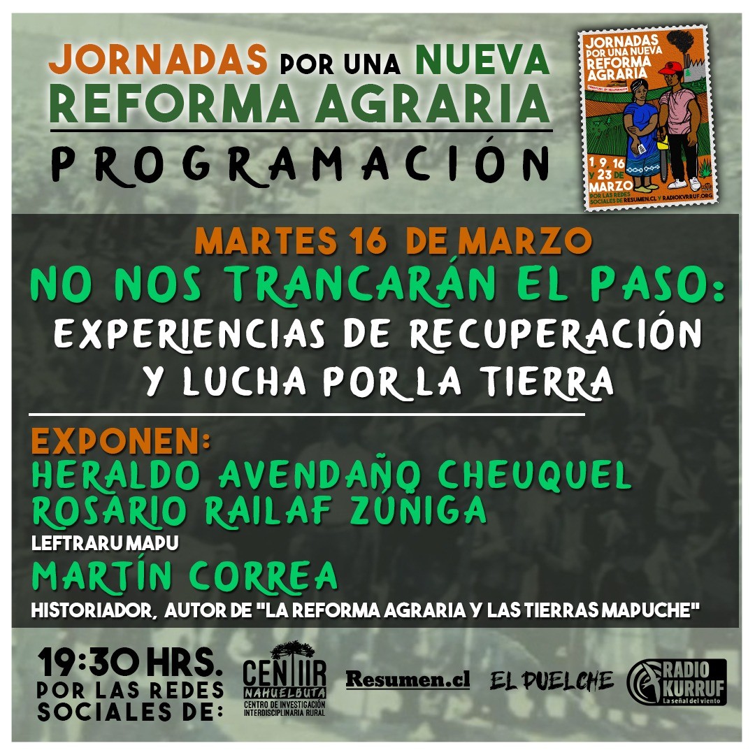Ese martes tendremos la perspectiva de «No nos trancarán el paso: experiencias de recuperación y luchas por la tierra" con Heraldo Avendaño Cheuquel y Rosario Railaf Zúñiga desde Leftraru Mapu y el historiador Martín Correa, autor de La Reforma Agraria y las Tierras Mapuche entre otros importantes trabajos de historiografía relacionados al proceso de la reforma agraria y la historia y reivindicación mapuche.