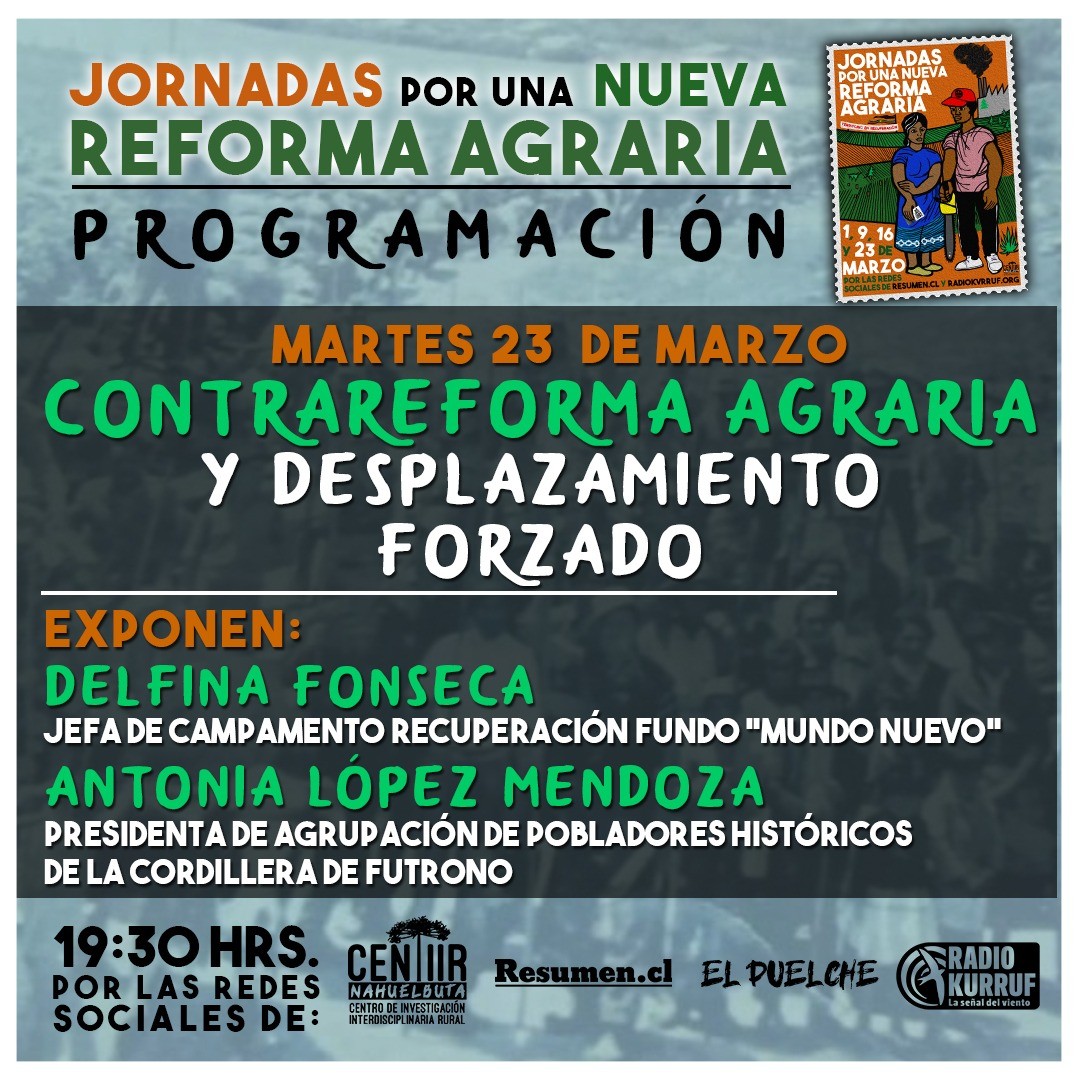 Desde las cordilleras, el martes 23 de enero, Delfina Fonseca, jefa del campamento recuperación del fundo «Mundo Nuevo» en Curanilahue y Antonia López Mendoza, Presidenta de la Agrupación de Pobladores Históricos de la Cordillera de Futrono en "Contrareforma Agraria y desplazamientos forzados"