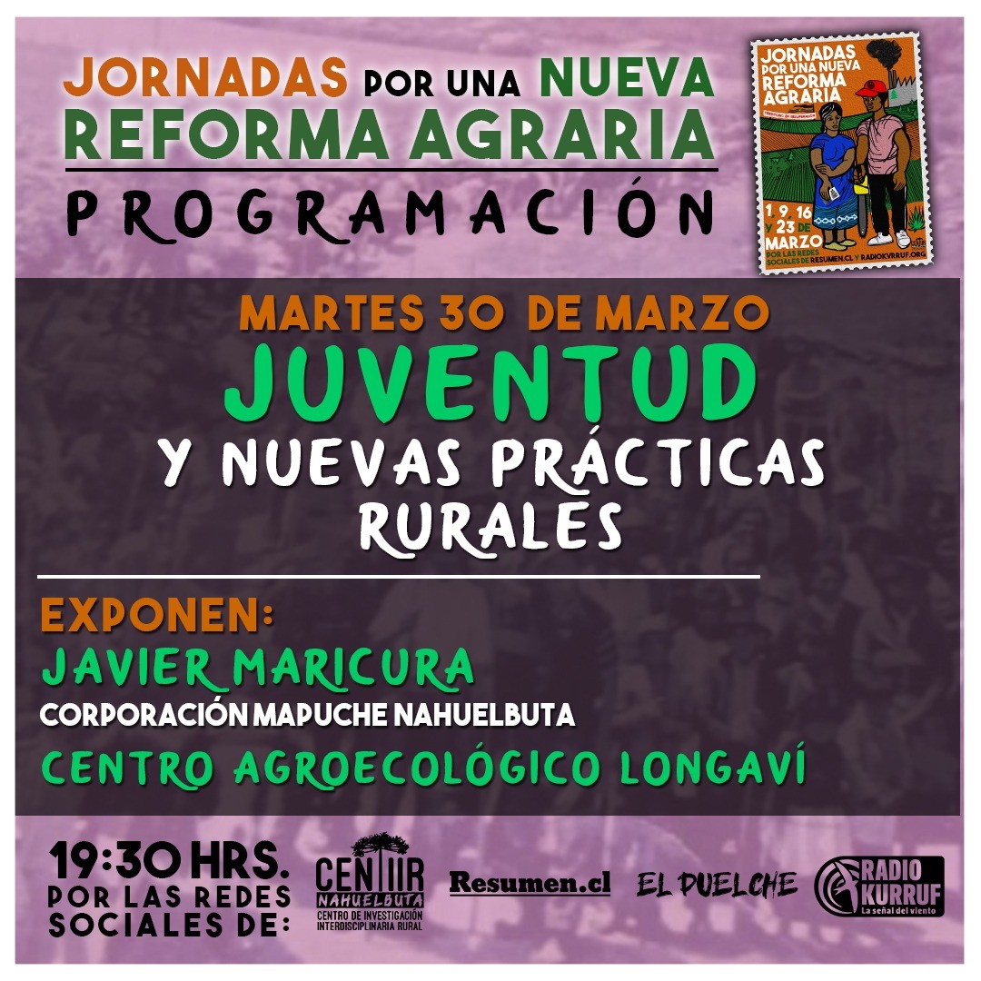 Este día se abordarán las experiencias actuales y la "Juventud y nuevas prácticas rurales" con Javier Maricura, de la Corporación Mapuche Nahuelbuta y el Centro Agroecológico Longaví.