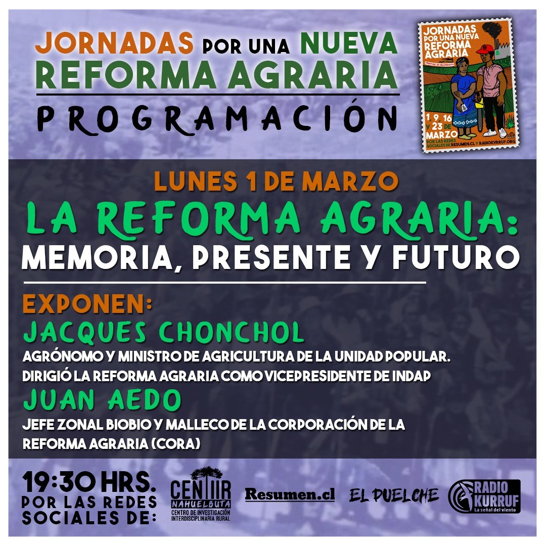 Esta iniciativa, la cual consistirá en una serie de exposiciones vía streaming, contará con la experiencia de sus precursores, con Jacques Chonchol, quien fuese el vicepresidente de INDAP y Ministro de Agricultura durante la Reforma Agraria y además Juan Aedo, Jefe Zonal Biobío/Malleco de la Corporación de la Reforma Agraria (CORA) en "Reforma Agraria: memoria, presente y futuro".