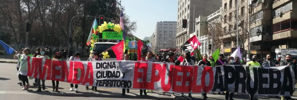 Miles de personas marcharon en respaldo a la propuesta del nuevo texto constitucional, apuntando a uno de los ejes que más ha tergiversado la opción Rechazo. La movilización fue desarrollada por comités de pobladoras y pobladores a favor de la opción Apruebo en el marco de la exigencia de una Vivienda Digna.Por J. Arroyo Olea