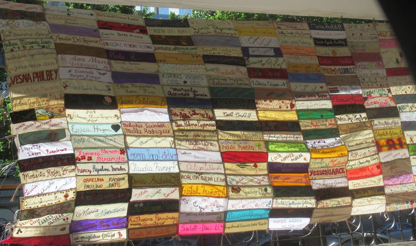 Yo participé muchos años en una Colectiva que se llama “La Huacha Feminista” y hacíamos “La Caminata del Silencio”, entonces desde ahí nace esta idea. Nosotras portábamos todos los meses los nombres de las mujeres asesinadas. Como ahora estoy hace dos años en el bordado, me dije que pasa si los bordamos los nombres. Yo esta actividad también la soñé. Yo estaba estudiando para un Seminario de “Anti-monumentos” en México, anti-monumentos mexicanos, y estaba leyendo todo eso, y entre esa vivencia que tuve, más lo otro salió esta idea. Esto se hizo en forma virtual con México, me mandaron material y después hubo una conversación sobre anti-monumentos y en eso, yo sueño esto.
