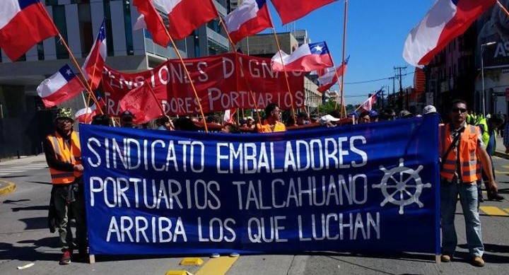 [resumen.cl] Más de tres mil trabajadores portuarios marcharon este viernes por las calles del centro penquista en el contexto de una paralización nacional iniciada el pasado martes. Provenían de los puertos de Coronel, Muelle CAP, San Vicente, Talcahuano, Muelles Penco y Lirquén, demandando el cumplimiento del acuerdo de pensiones anticipadas pactado en enero de este año, según el cual doscientos trabajadores debieron haber accedido a su jubilación anticipada, no obstante solo lo ha hecho el 25% de éstos, por trabas y obstáculos burocráticos.