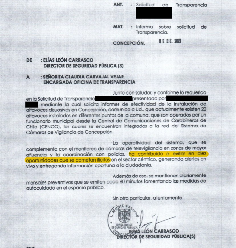Pese a solicitar los informes de efectividad de la instalación de altavoces disuasivos, y que previamente se había indicado que estos se encontraban en análisis, la respuesta de la Dirección de Seguridad Pública fue breve: "La operatividad del sistema, que se complementa con el monitoreo de cámaras de televigilancia en zonas de mayor afluencia y la coordinación con policías, ha contribuido a evitar en diez oportunidades que se cometan ilícitos en el sector céntrico, generando alertas en vivo y entregando información oportuna a la ciudadanía".