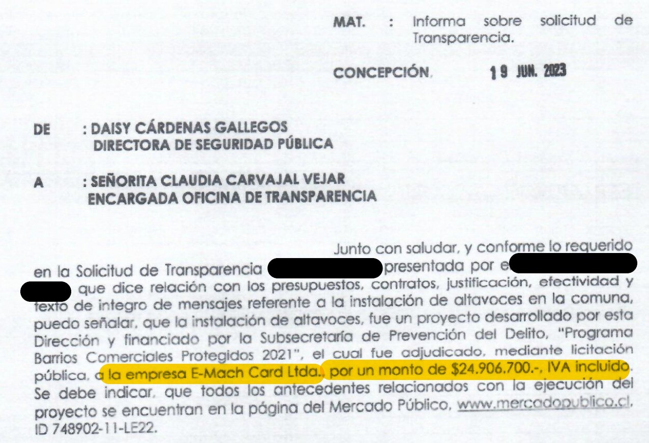 A inicios de marzo de 2023, la Municipalidad de Concepción comunicaba el inicio de operaciones de 20 altavoces en el centro penquista, con la finalidad de "robustecer las medidas de autocuidado en el espacio público y la vigilancia a través de la transmisión de alertas en vivo de acuerdo a lo visualizado en el monitoreo de la red comunal de cámaras de televigilancia".