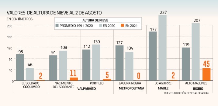 En esta linea, la Dirección General de Aguas (DGA) planteó que existe un déficit promedio del 92% de los niveles de nieve alcanzando de esta forma los niveles mínimos.