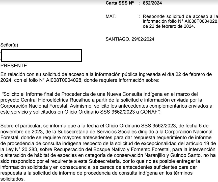 En su respuesta, la Subsecretaría de Servicios Sociales indicó que "a la fecha el Oficio Ordinario SSS 3562/2023, de fecha 6 de noviembre de 2023, de la Subsecretaría de Servicios Sociales dirigido a la Corporación Nacional Forestal, donde se requiere mayores antecedentes para dar respuesta requerimiento de informe de procedencia de consulta indígena respecto de la solicitud de excepcionalidad del artículo 19 de la Ley N° 20.283, sobre Recuperación del Bosque Nativo y Fomento Forestal, para la intervención o alteración de hábitat de especies en categoría de conservación Naranjillo y Guindo Santo, no ha sido respondido por el requirente a esta Subsecretaría, por lo que no es posible entregar la información solicitada y en consecuencia, se carece de antecedentes suficientes para dar respuesta a la solicitud de informe de procedencia de consulta indígena en los términos solicitados".