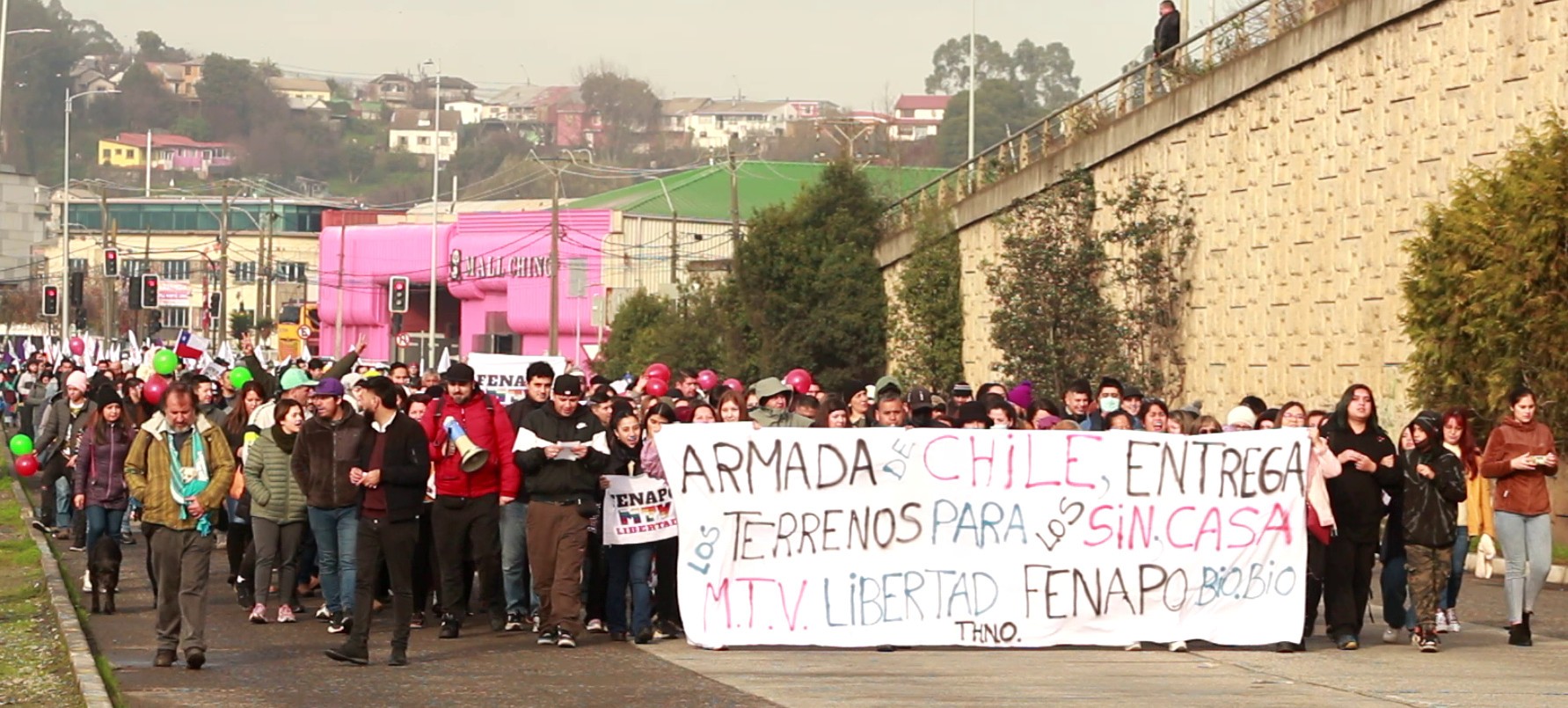 [resumen.cl] Este jueves en la mañana se registró una de las marchas más masivas en la intercomuna en el último tiempo. El movimiento de pobladores y pobladoras agrupados en la FENAPO (Federación Nacional de Pobladores) recorrió el centro de la ciudad para entregar una carta abierta con seis puntos a tratar: No a la Ley Anti-Tomas; Reforma Tributaria, recuperación de terrenos de las FF.AA., No a las alzas, Caso Fundaciones y lento avance del plan de emergencia habitacional.
