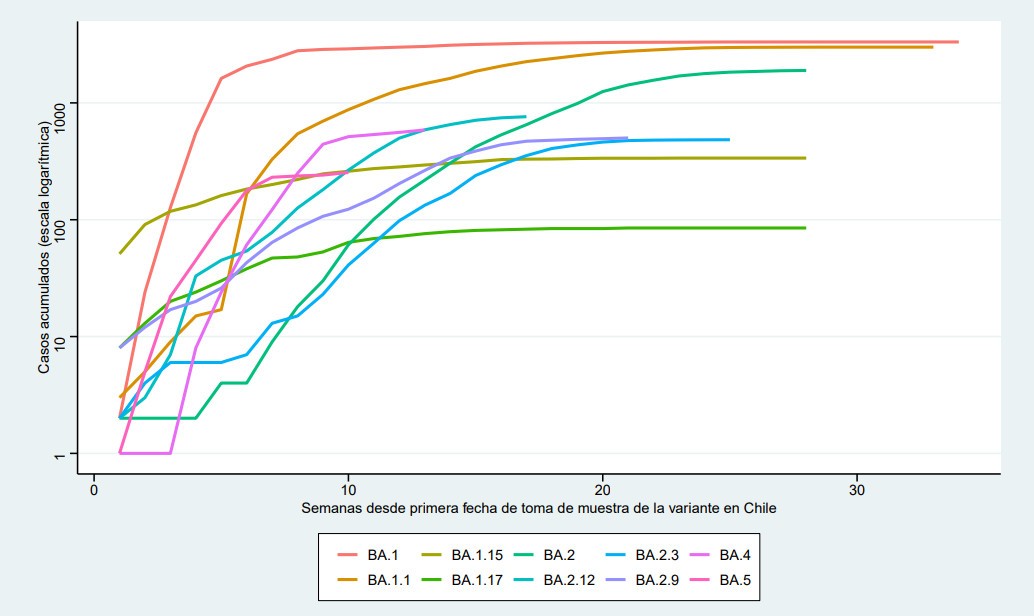 A continuación, el siguiente gráfico muestra los casos acumulados de variantes de linajes Ómicron secuenciados desde la primera semana de detección del caso en Chile, entre noviembre de 2021 y el 26 de julio de 2022.