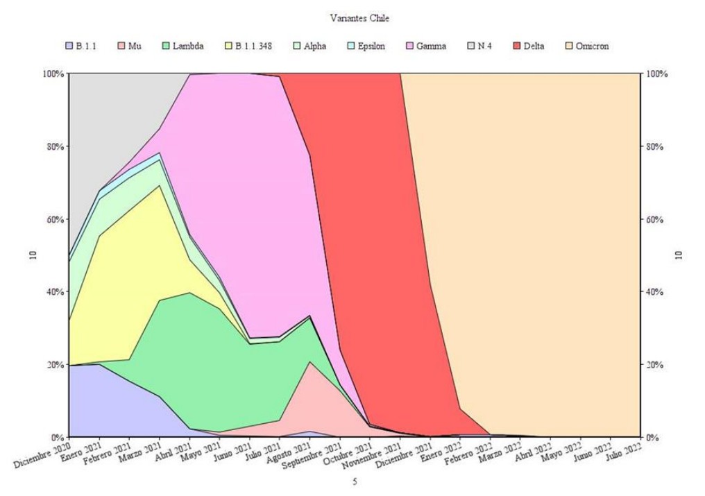 El siguiente gráfico muestra la Evolución de los linajes predominantes de SARS-CoV-2 en Chile, entre diciembre 2020 y 27 de julio 2022.
